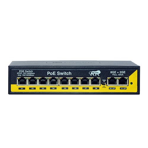 The PoE 8GE+2GE switch offers 8 gigabit Ethernet PoE ports and 2 gigabit uplink ports, ensuring maximum speed and reliability for demanding network environments.